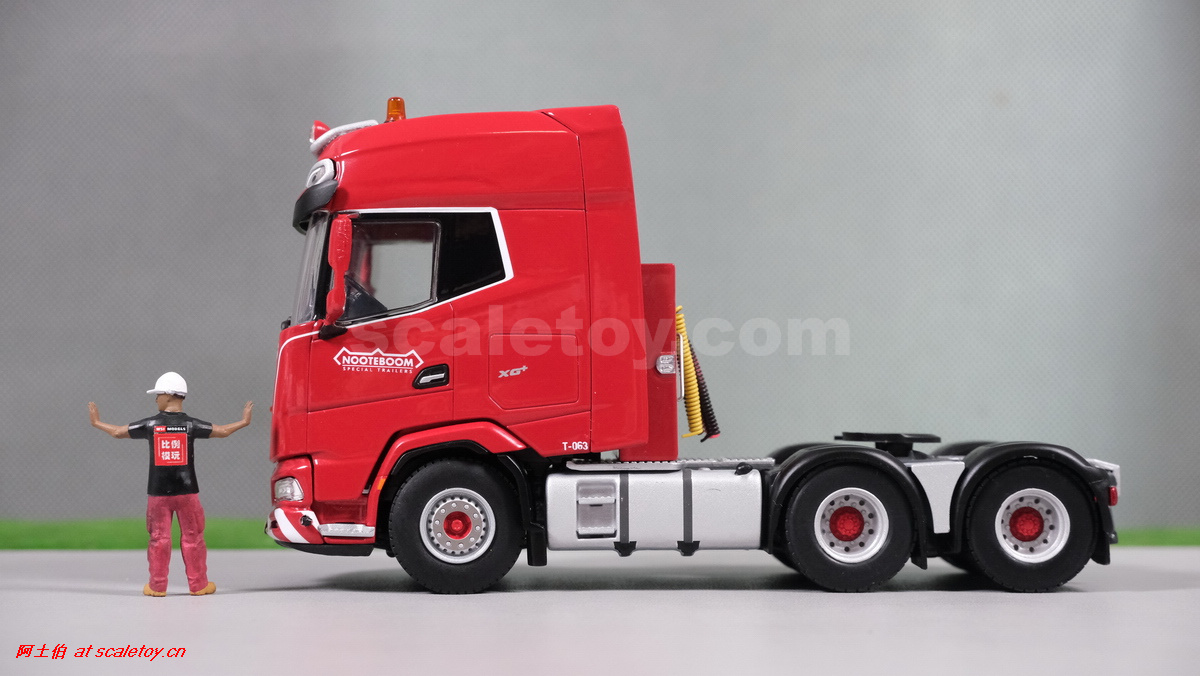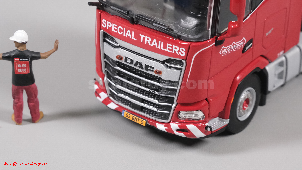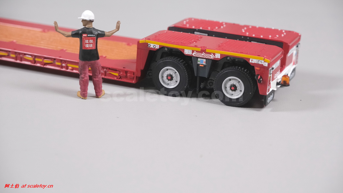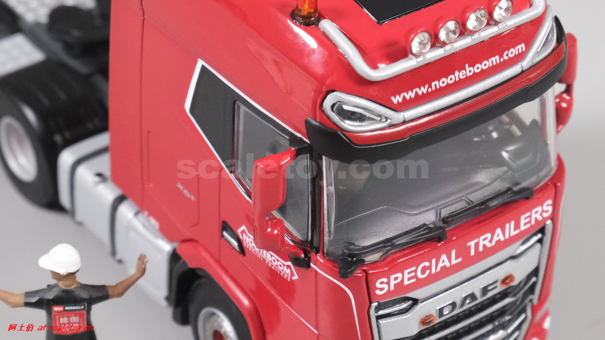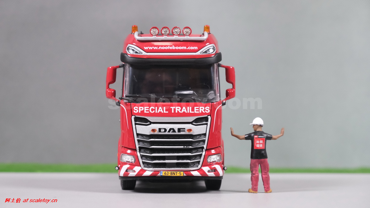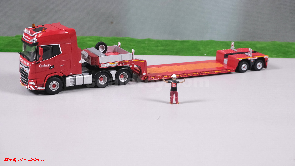 今天介绍的WSI的Nooteboom Red Line系列,也是一台EURO PX拖板,由一台达夫XG+ MY25 6X4拖头,挂两轴EURO PX 欧式低板。模型编号02-3725 / 6073366,比例1/50。