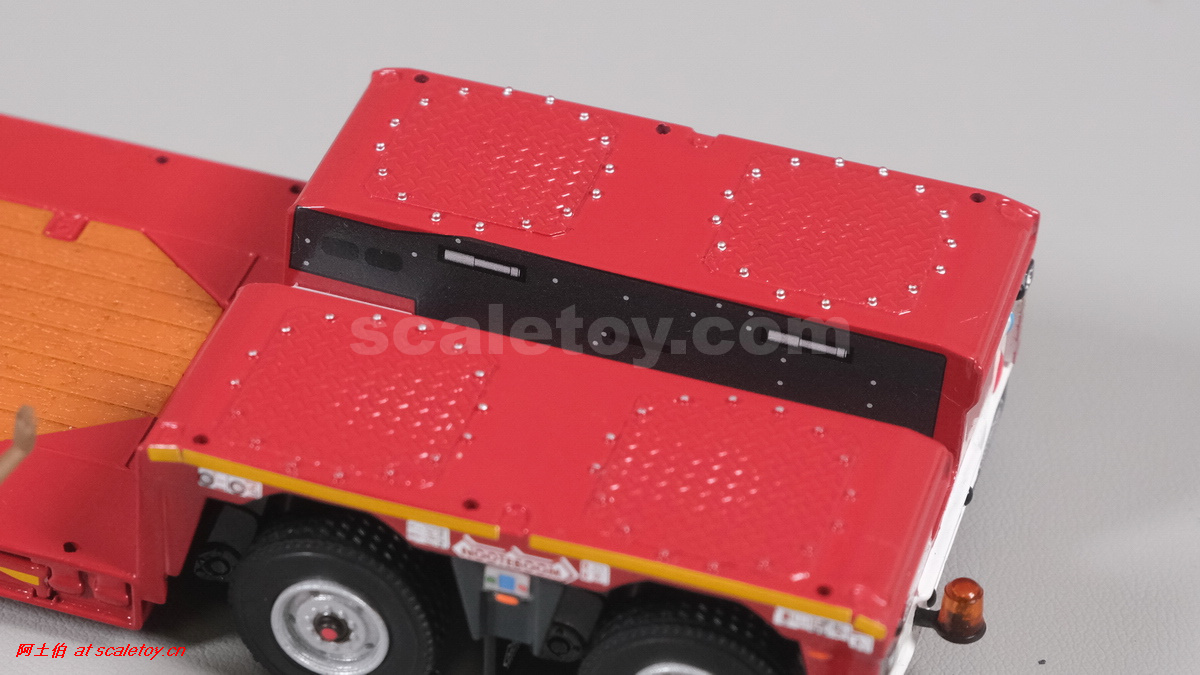 驾驶室背后。上面有单独的横杠结构,两侧是灯组。下方有小照明灯。都是单独构件。下方是工具箱,中央挖空了放备胎,有扶手