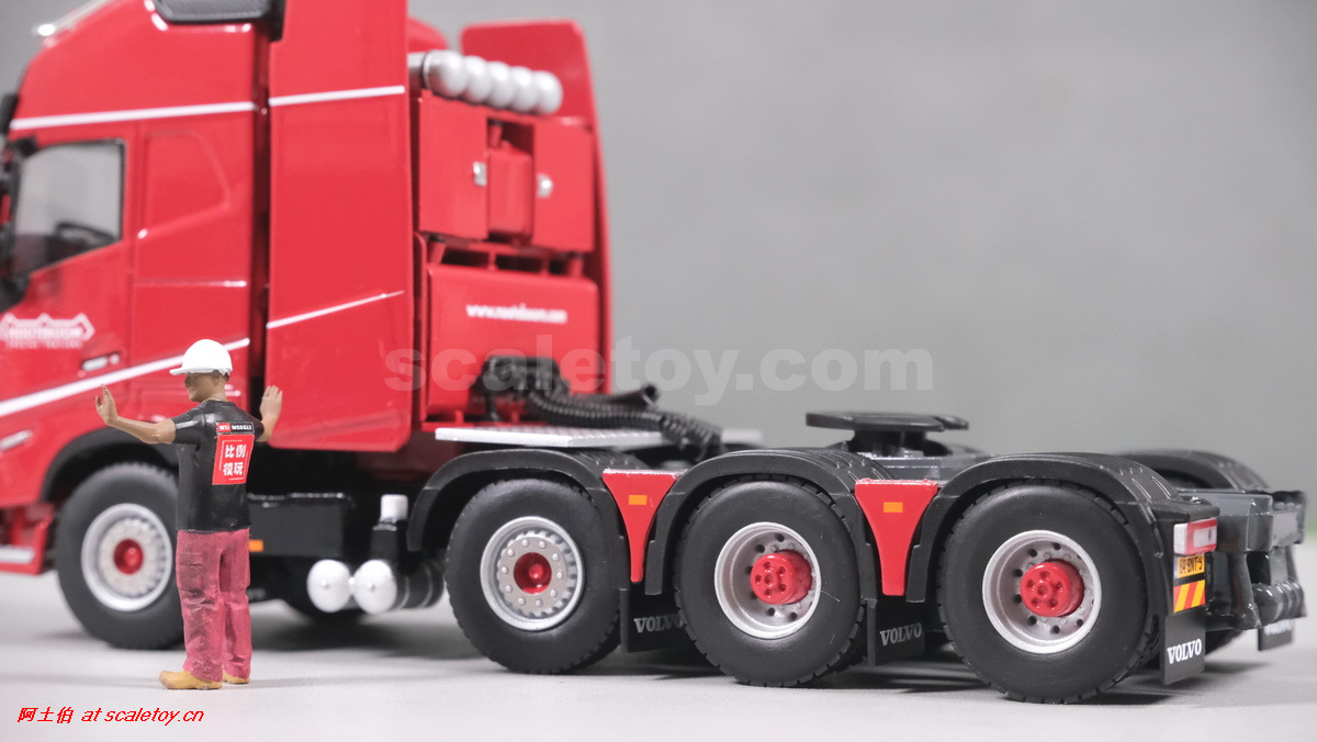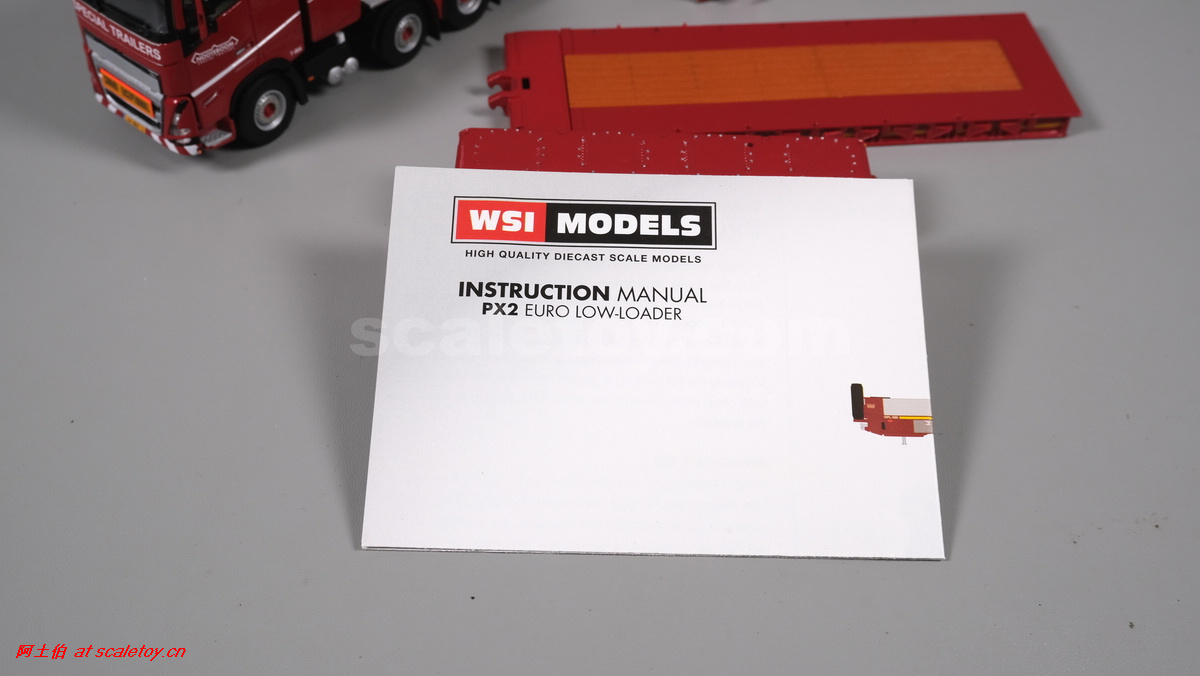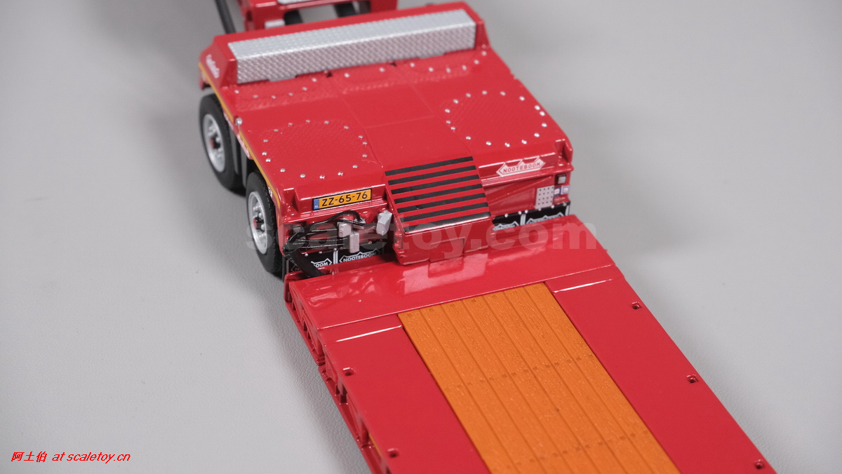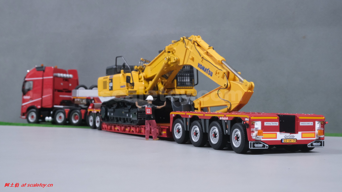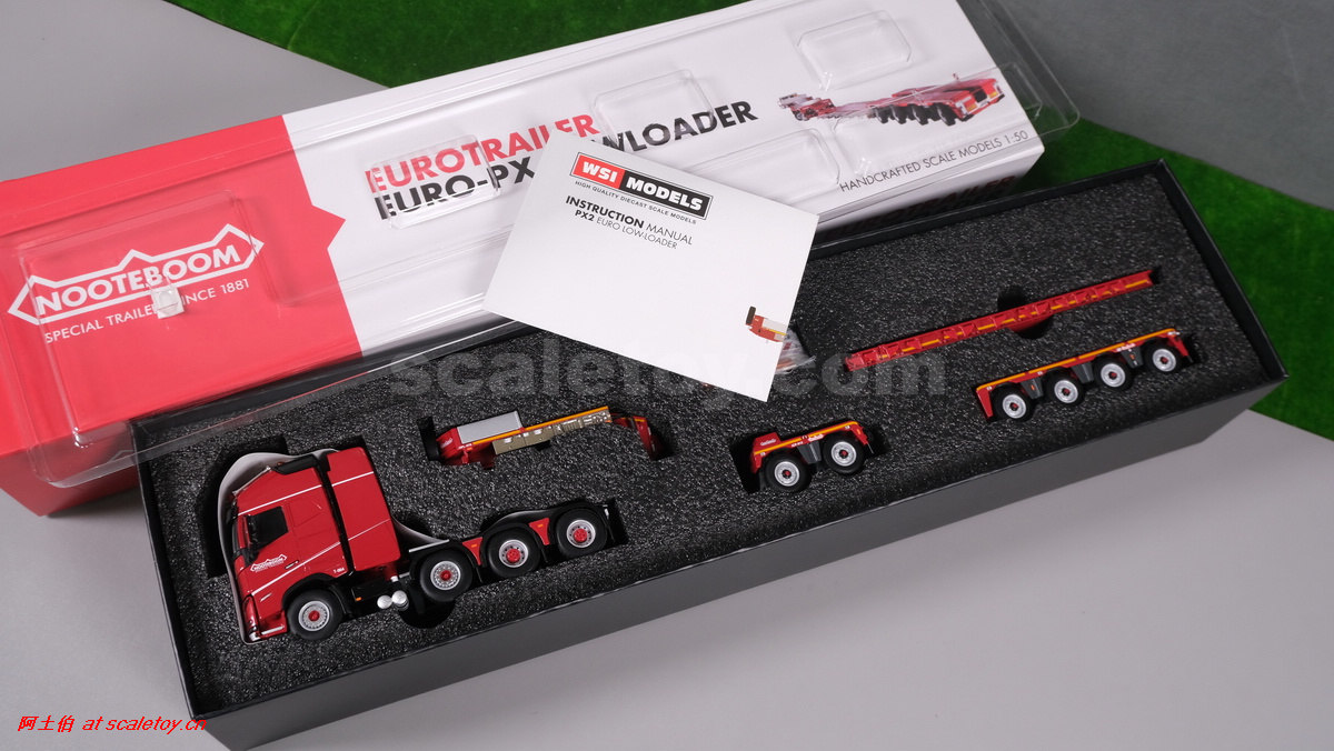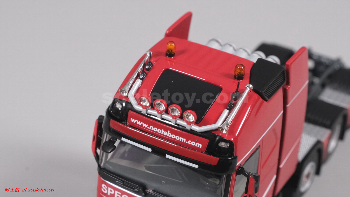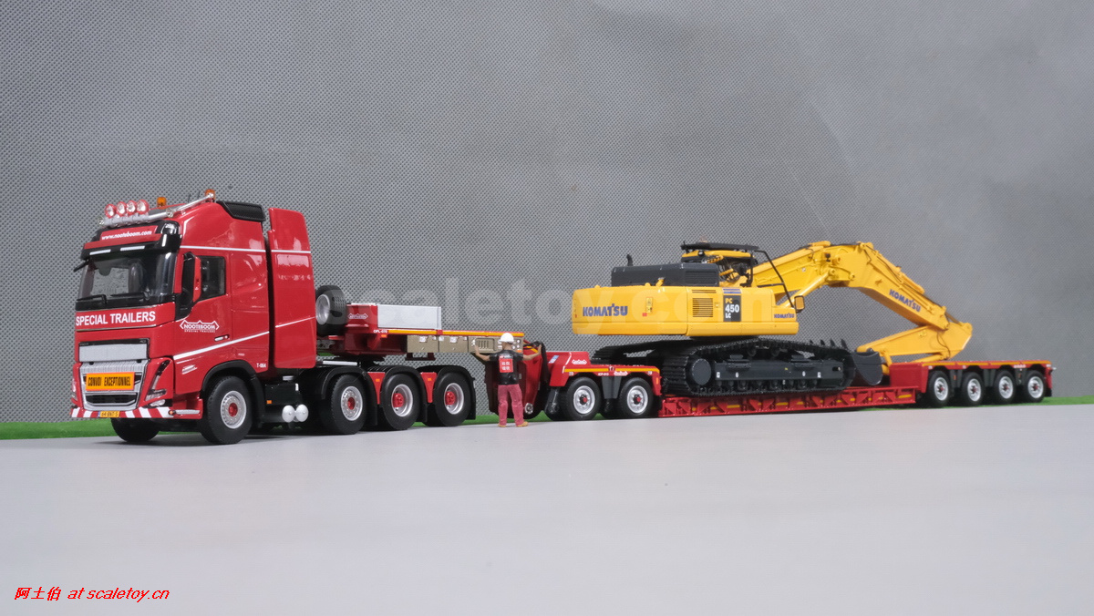 今天介绍的模型也是WSI的Nooteboom Red Line系列,一台沃尔沃的FH5 GLOBETROTTER XL 8X4拖头,挂NOOTEBOOM的4轴低板,配两轴interdolly。