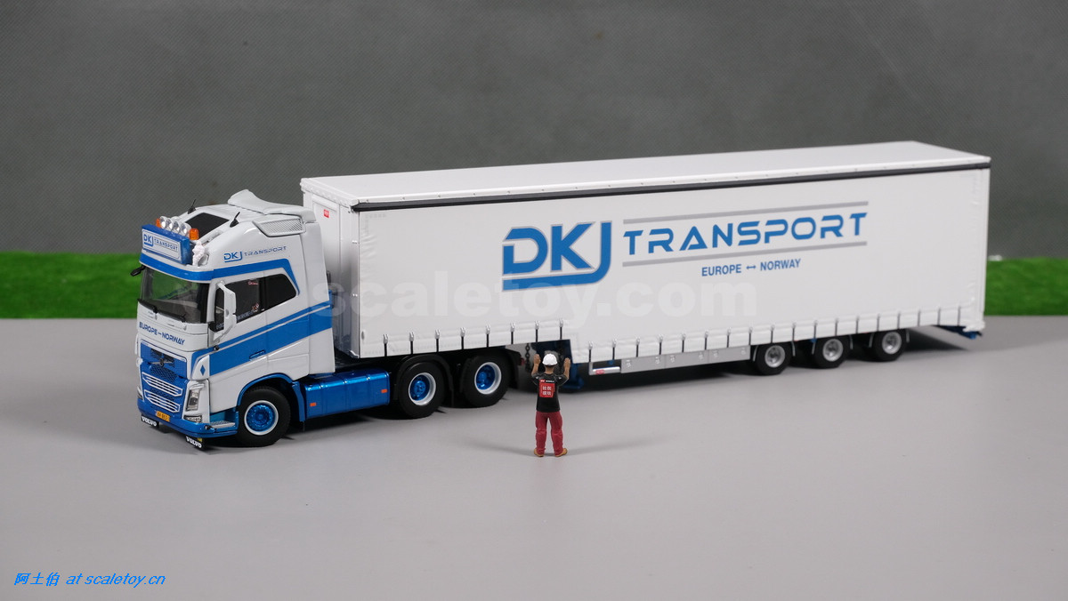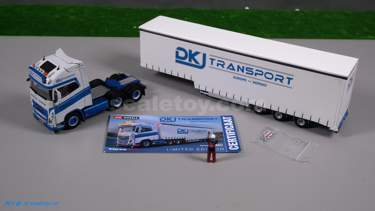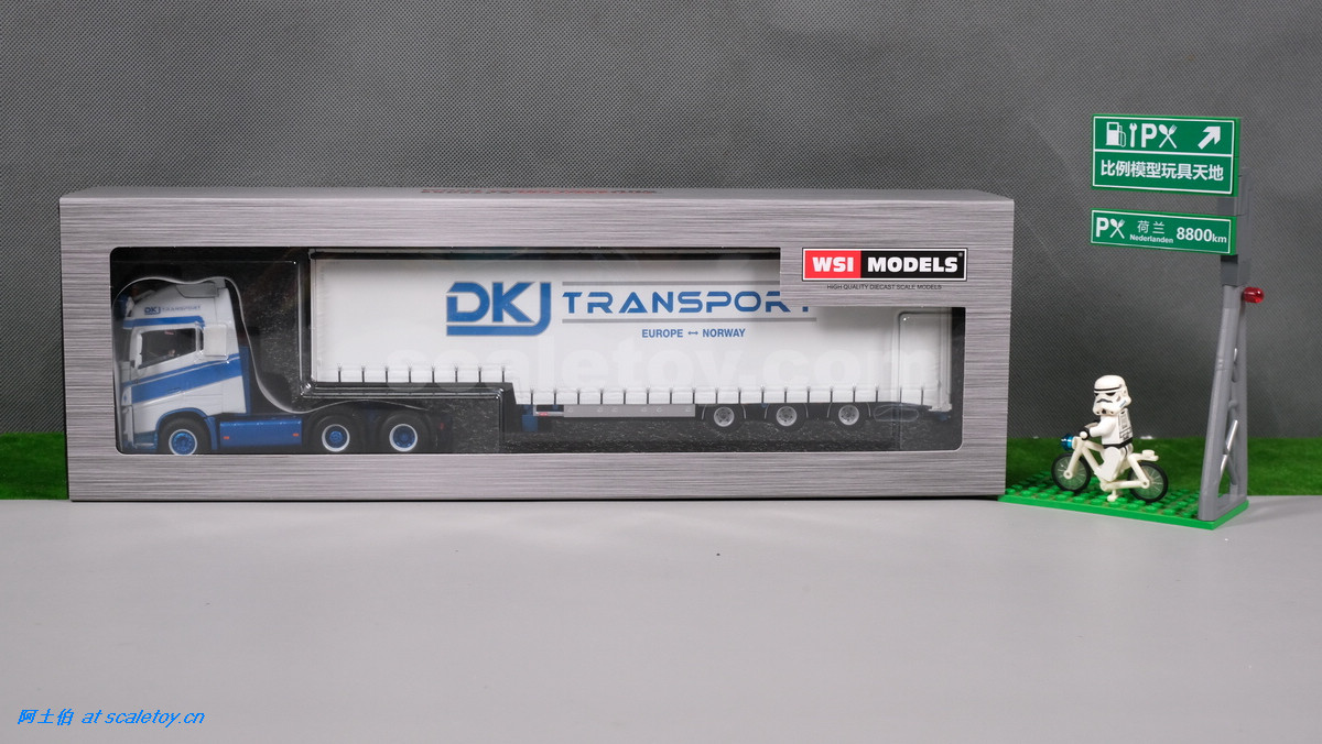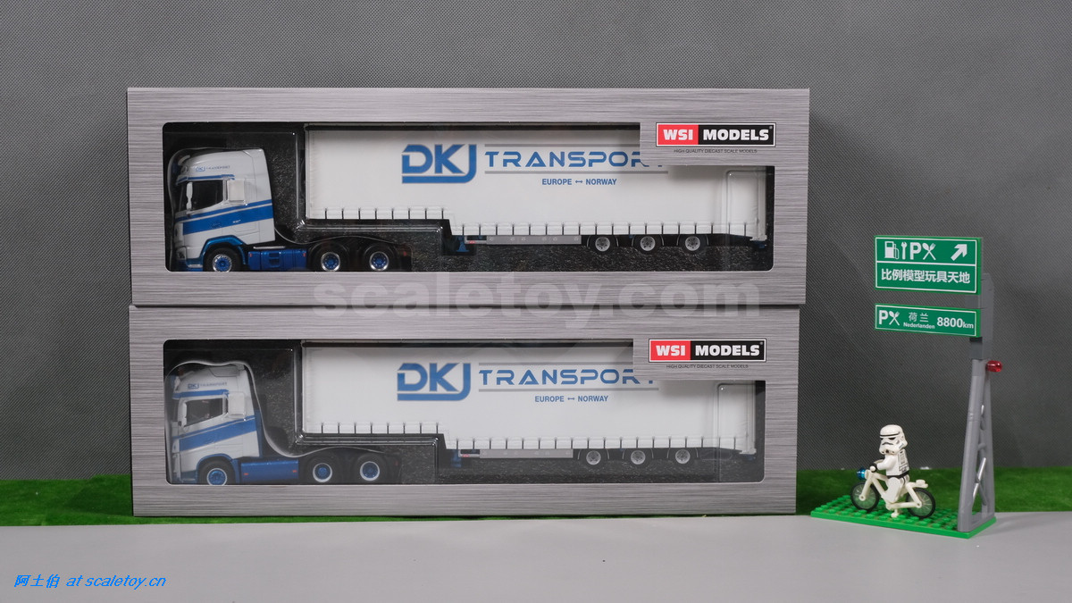 WSI制作了公司两款侧帘半挂车模型,分别是01-4555的沃尔沃拖头,和01-4556的达夫拖头