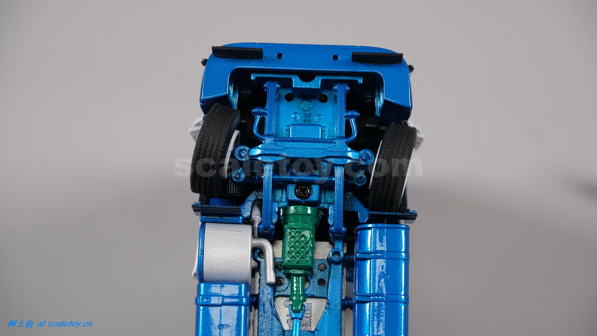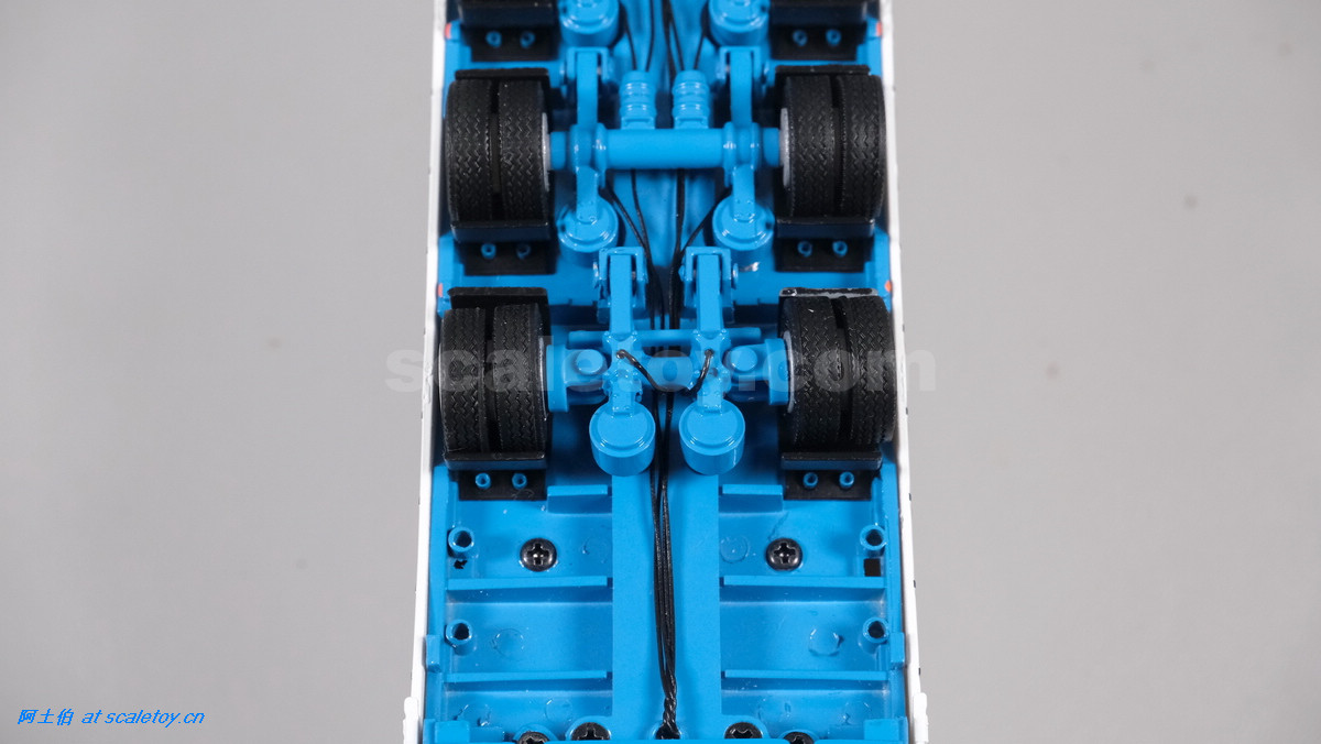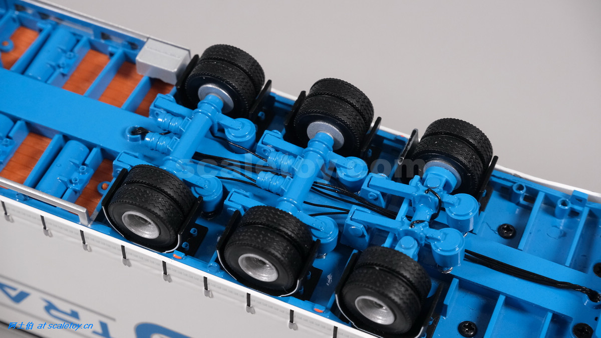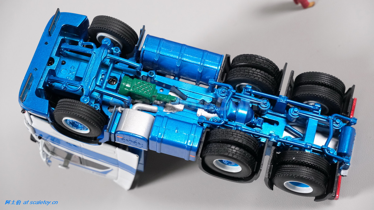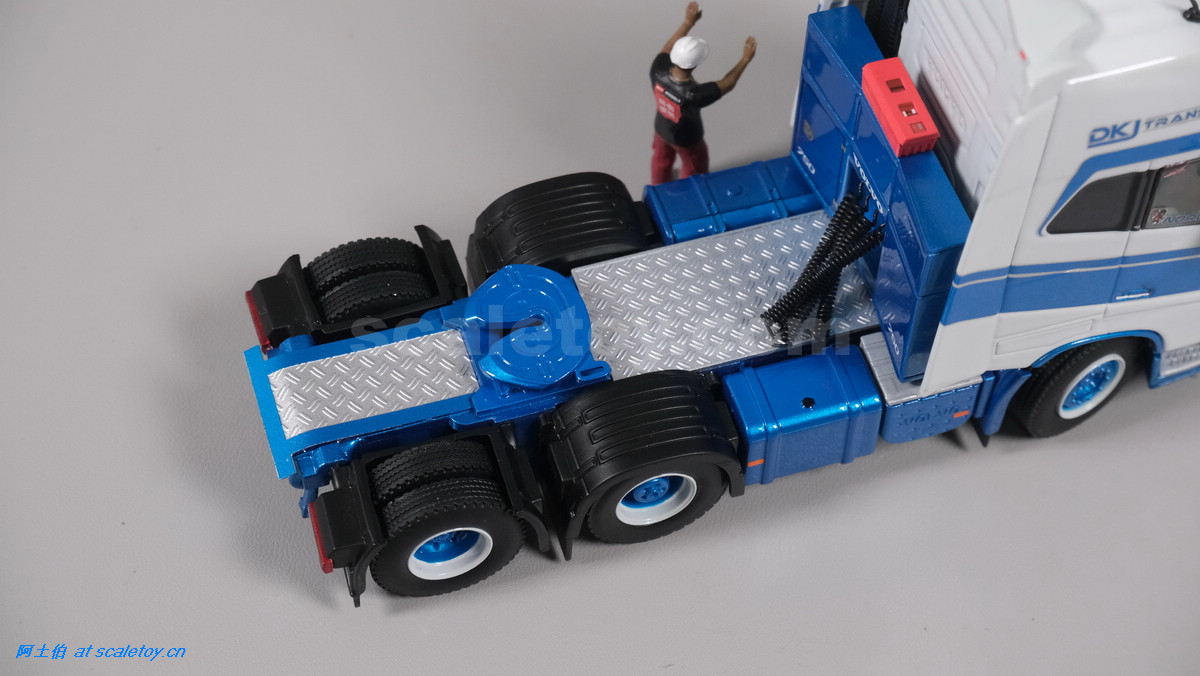 后轮,中间轴有挡泥板,而第三轴的挡泥板上方开了口,大概避免和挂车碰到?