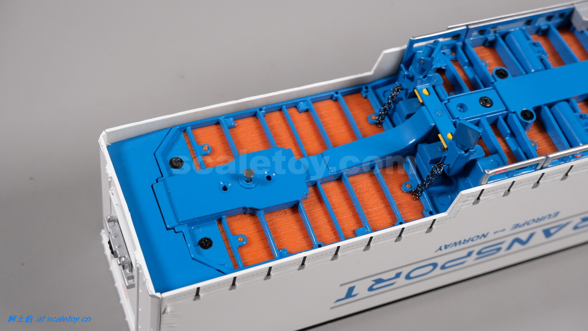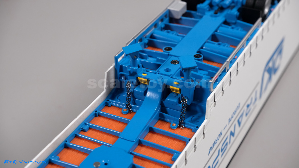 出列。比较特别的车型,不是传统那种方块的货仓,而是有高低的半低板上面做的货仓。