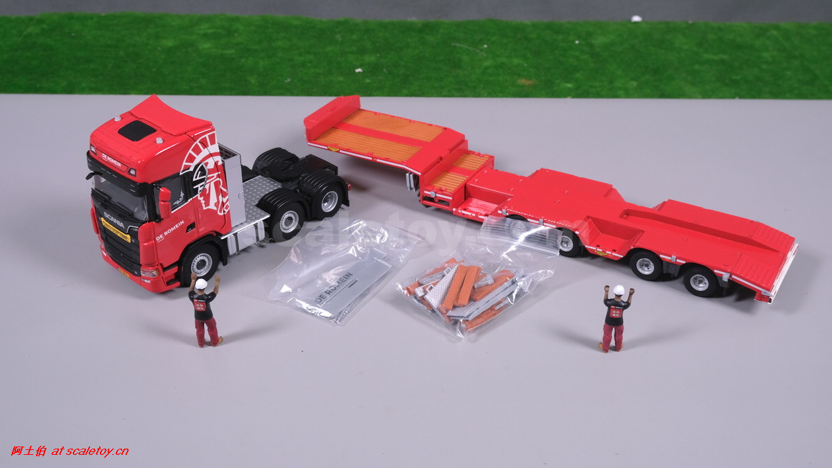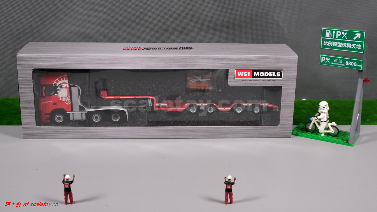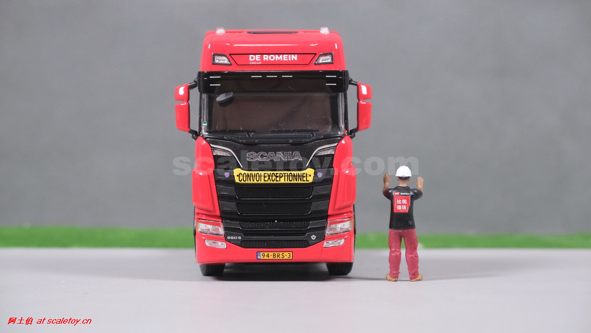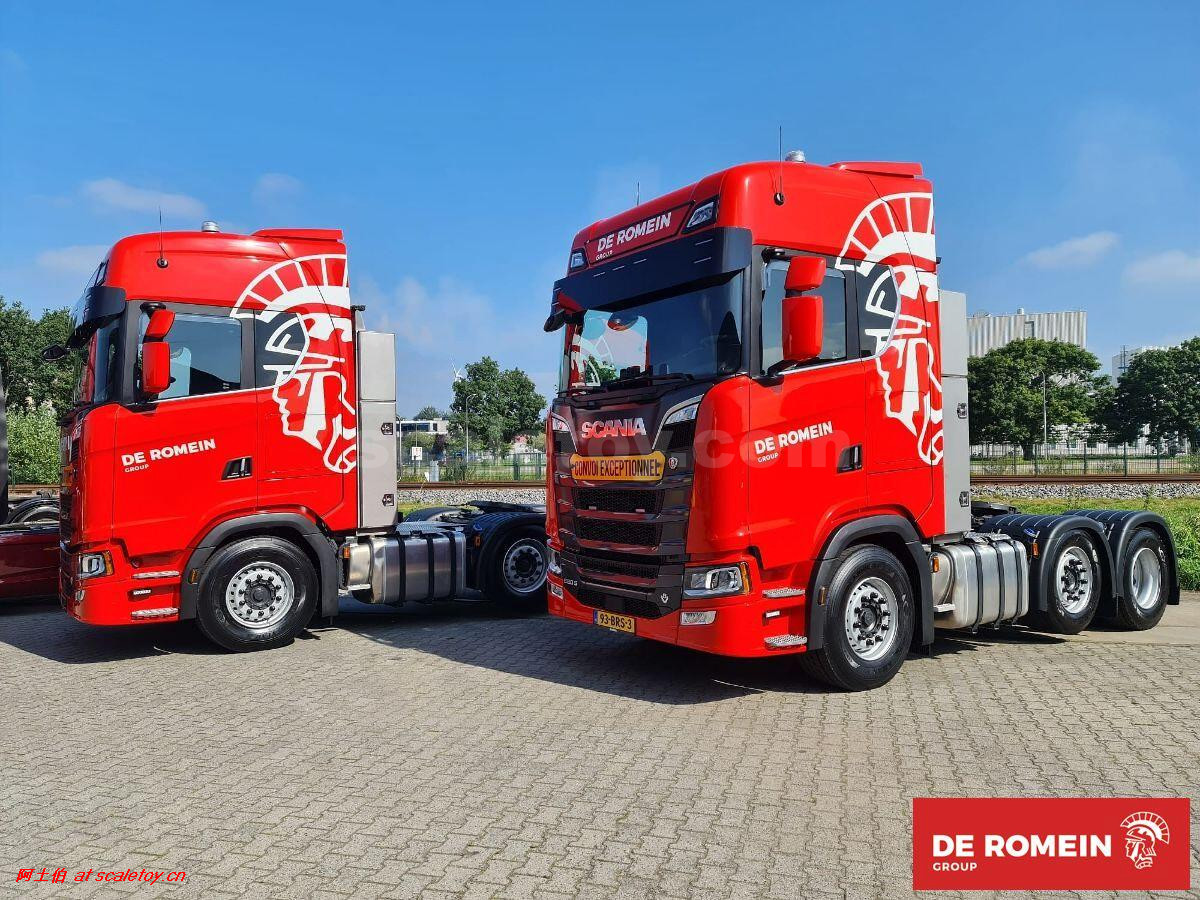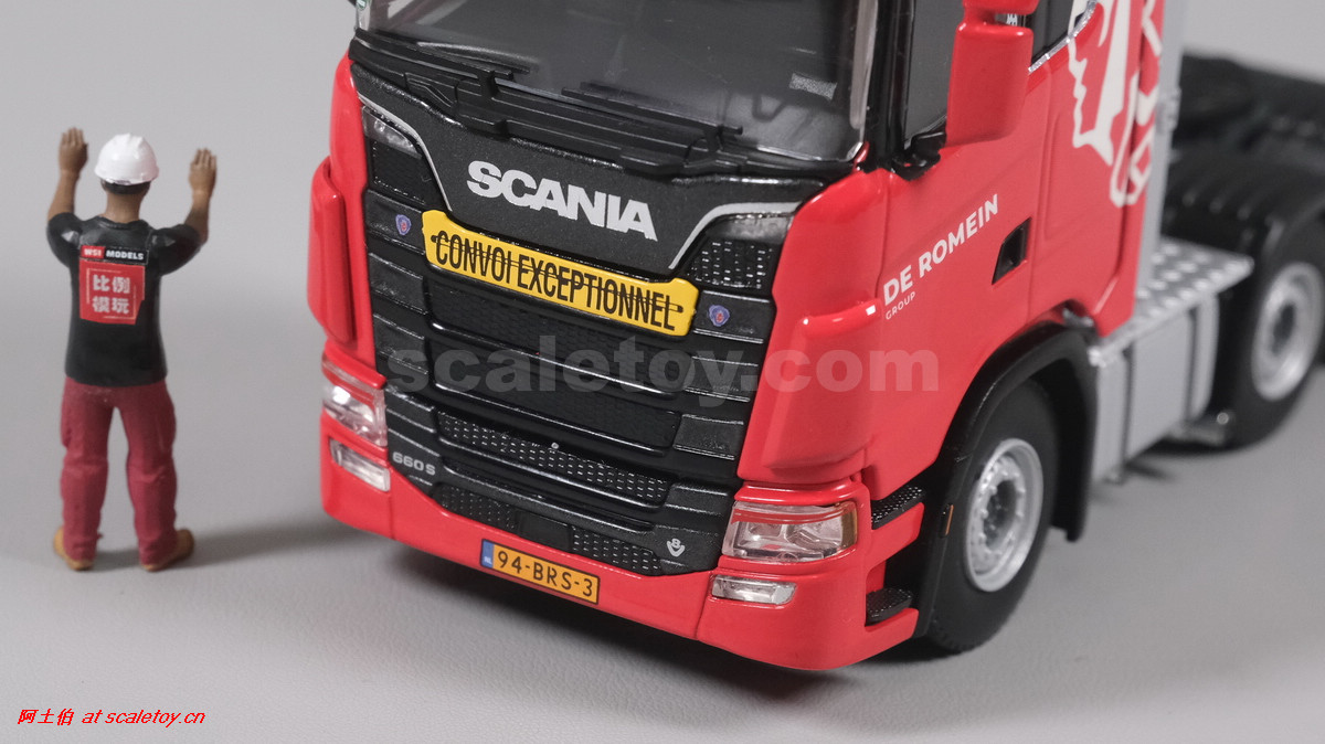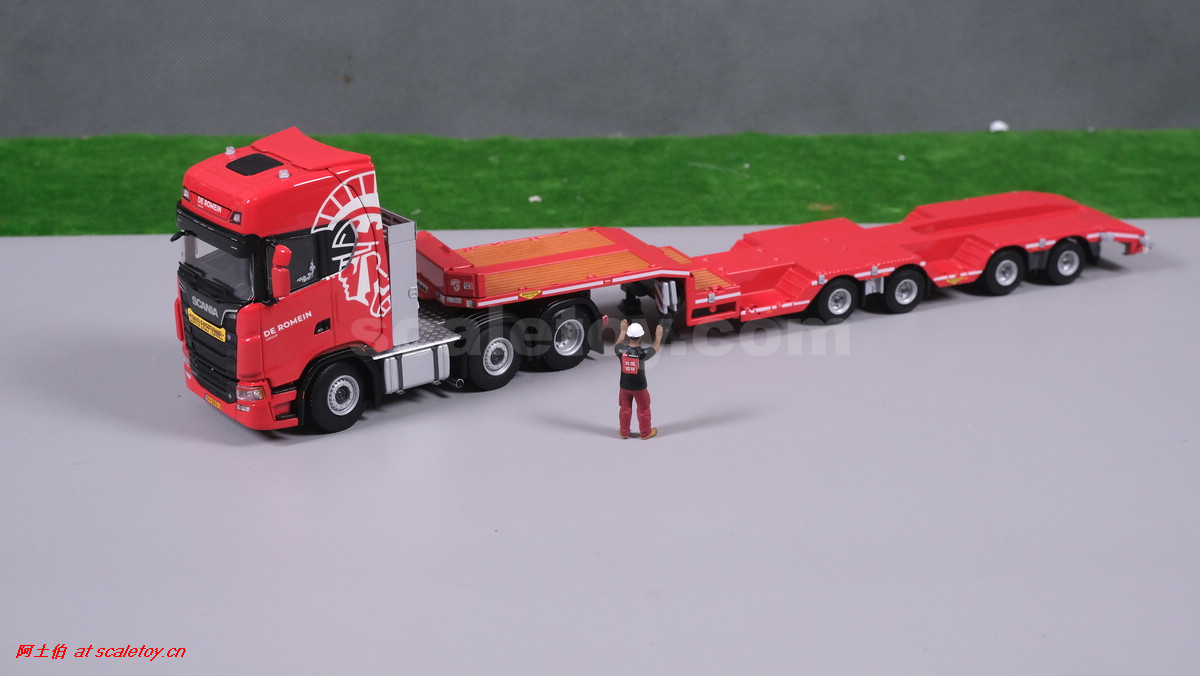 先看这款De Romein Groep的,斯堪尼亚 S系HIGHLINE CS20H 6X2 TWIN STEER拖头,BROSHUIS四轴轮井半低拖板。 模型编号01-4719,比例1/50: