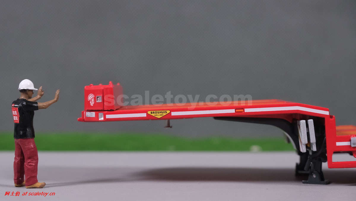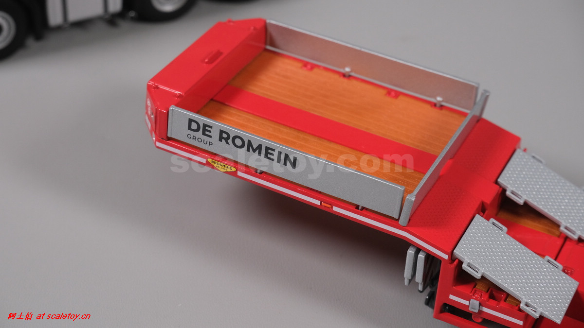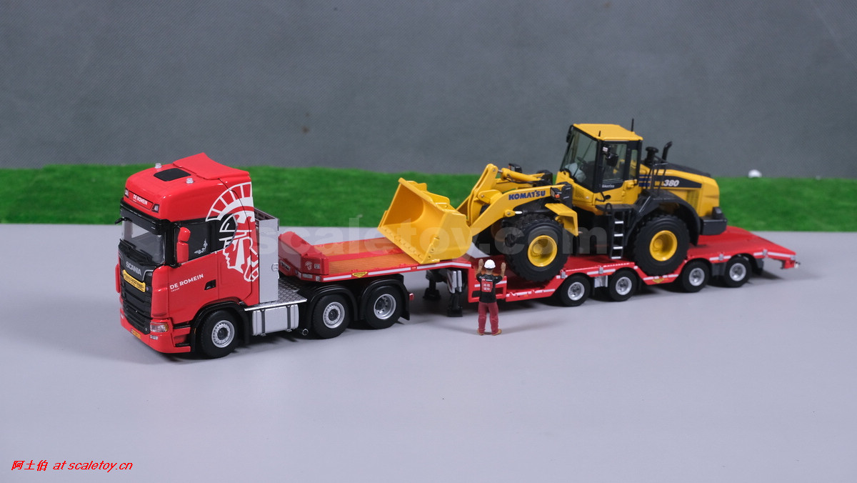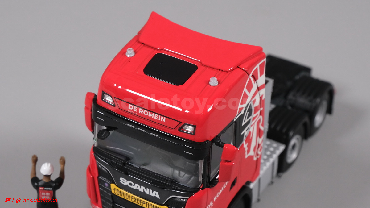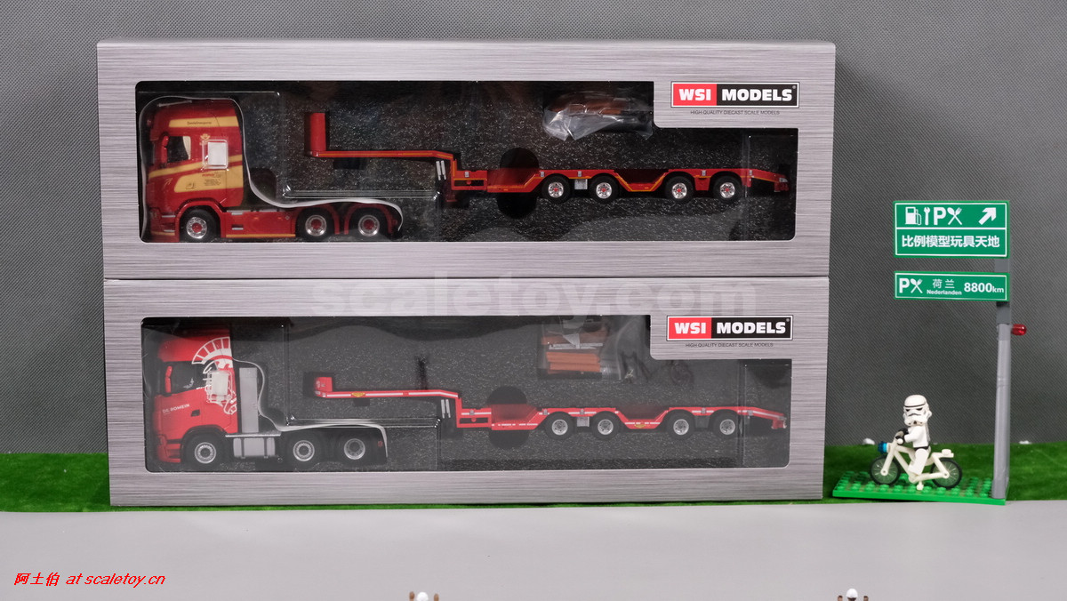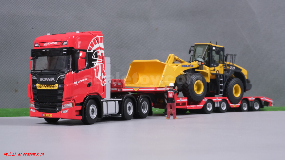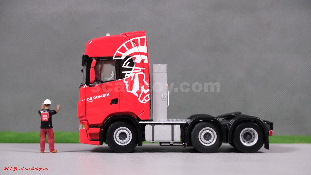 先看这款De Romein Groep的,斯堪尼亚 S系HIGHLINE CS20H 6X2 TWIN STEER拖头,BROSHUIS四轴轮井半低拖板。 模型编号01-4719,比例1/50: