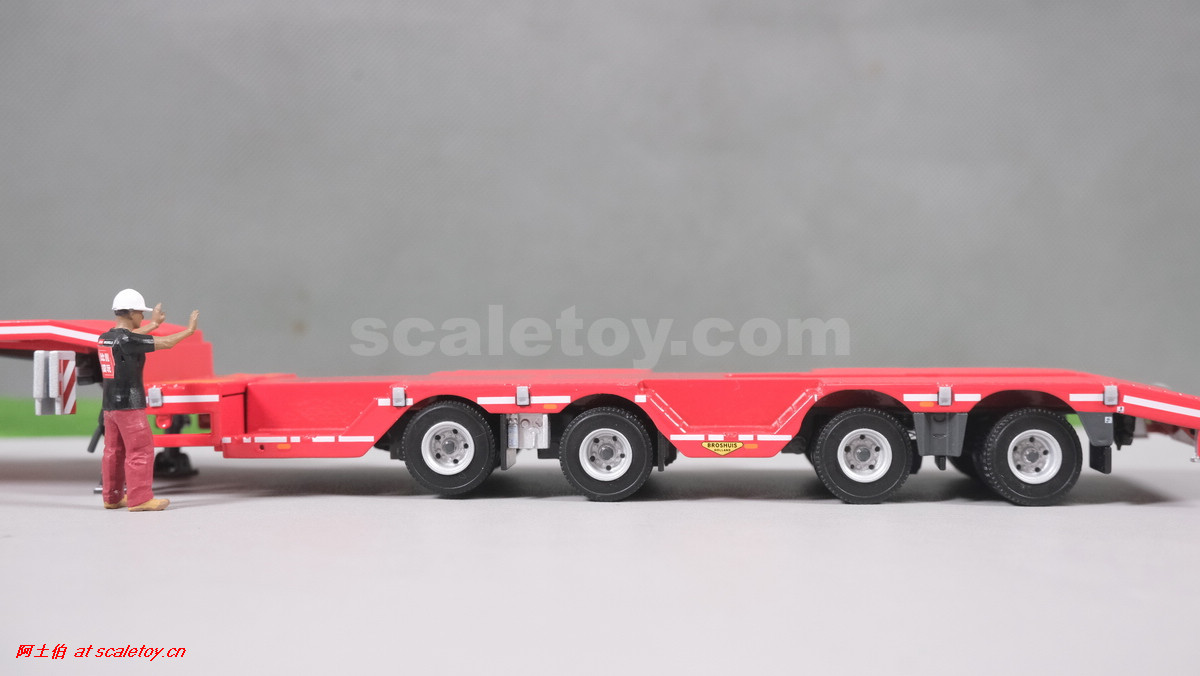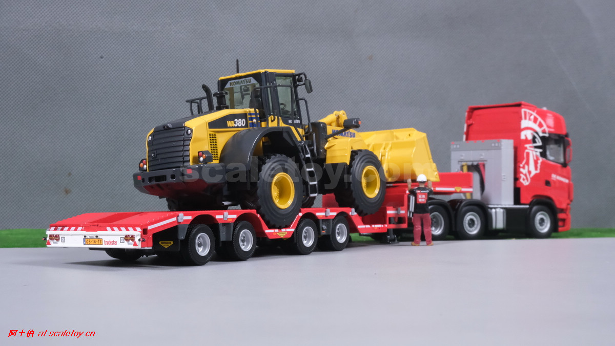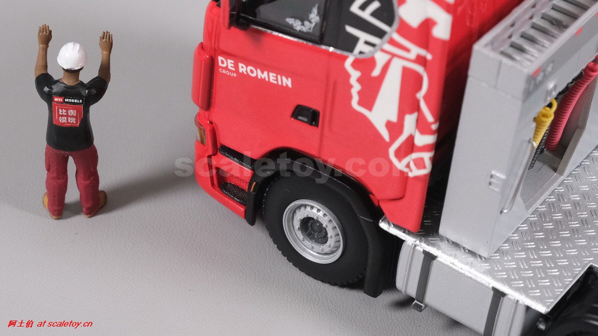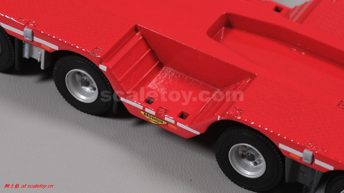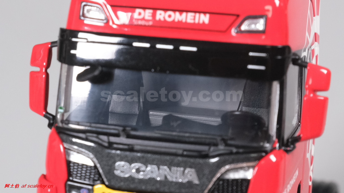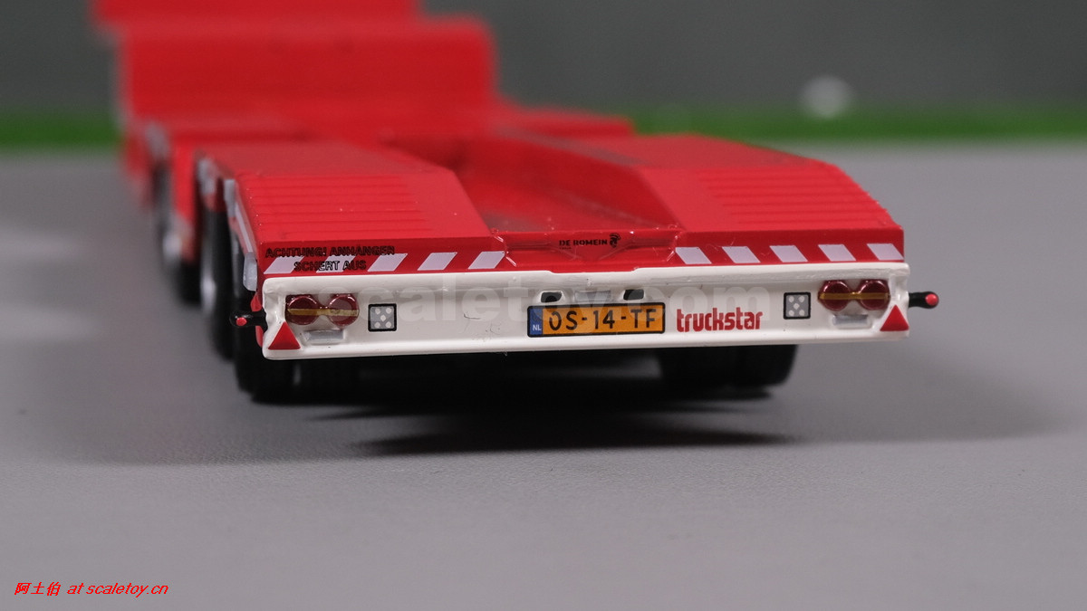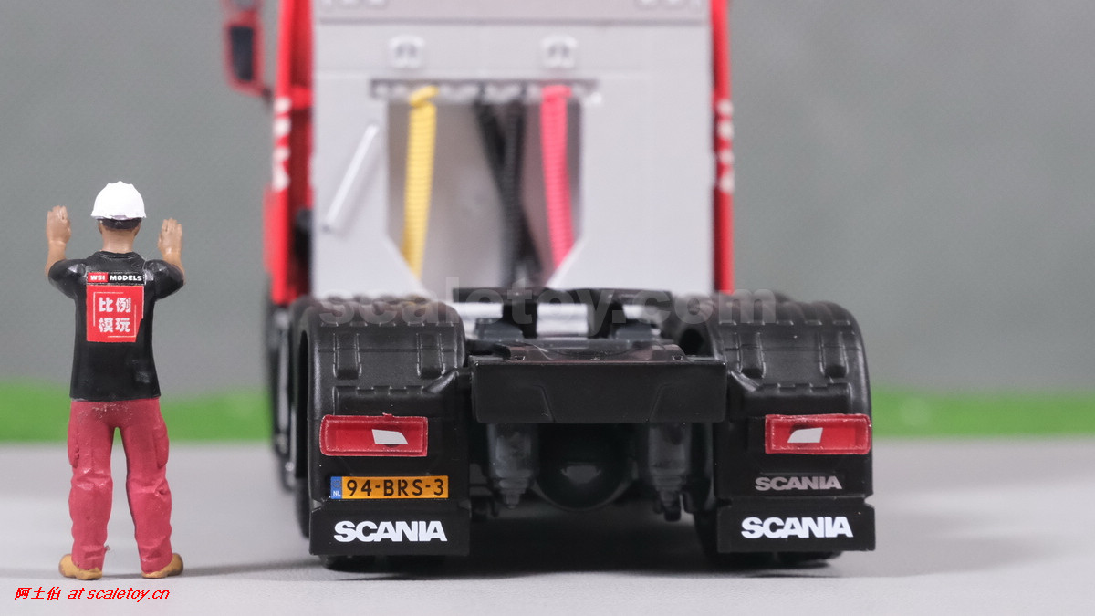 先看这款De Romein Groep的,斯堪尼亚 S系HIGHLINE CS20H 6X2 TWIN STEER拖头,BROSHUIS四轴轮井半低拖板。 模型编号01-4719,比例1/50: