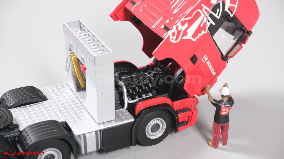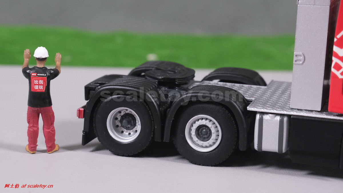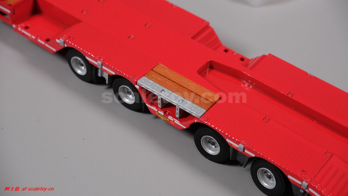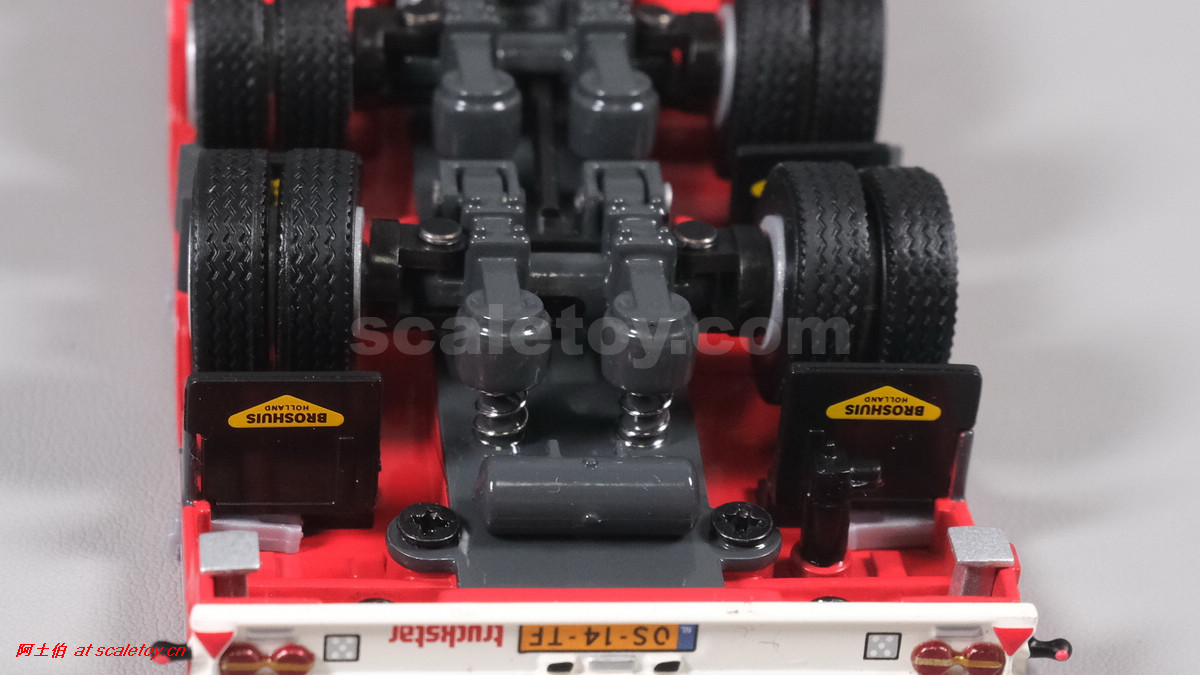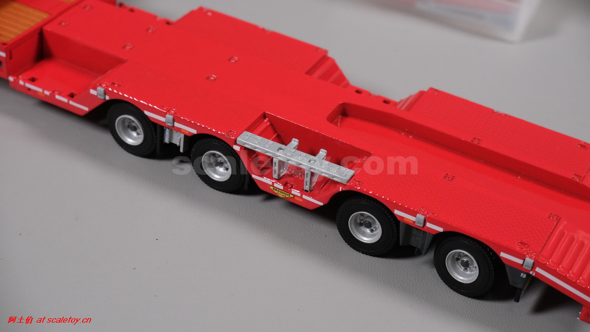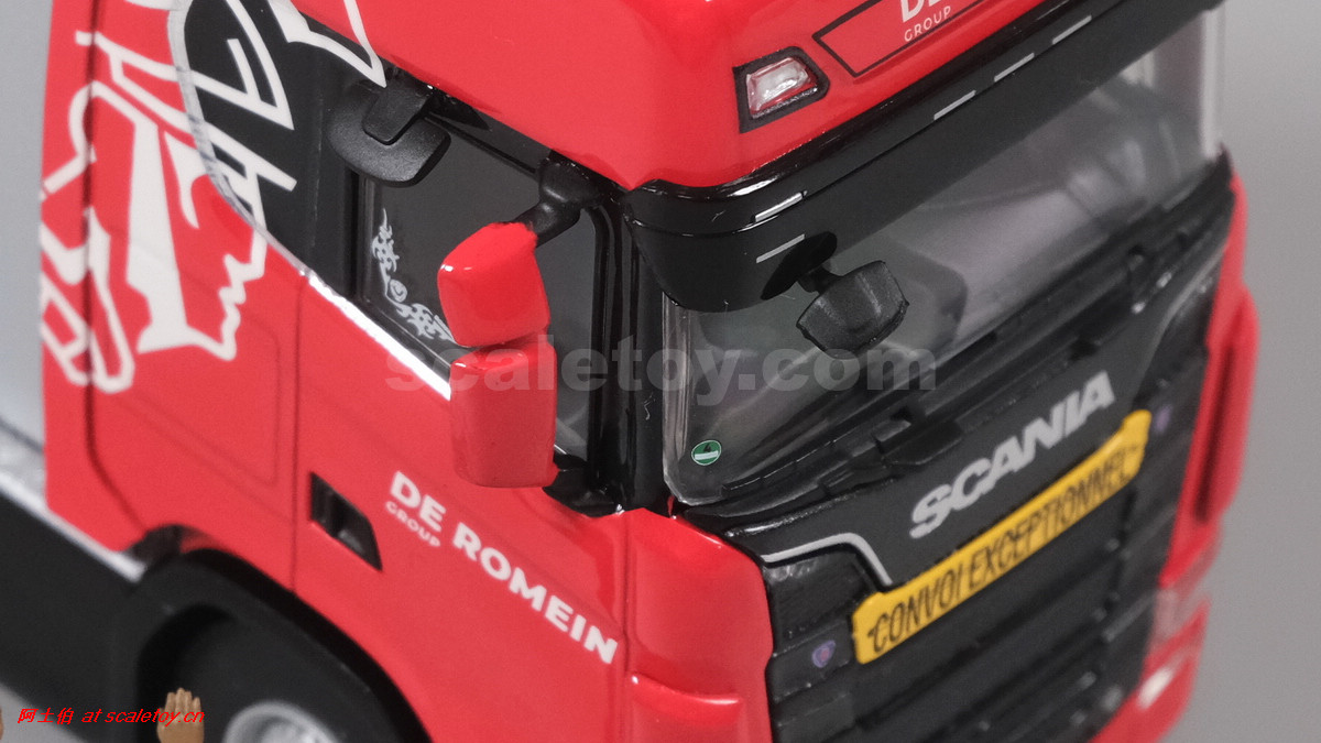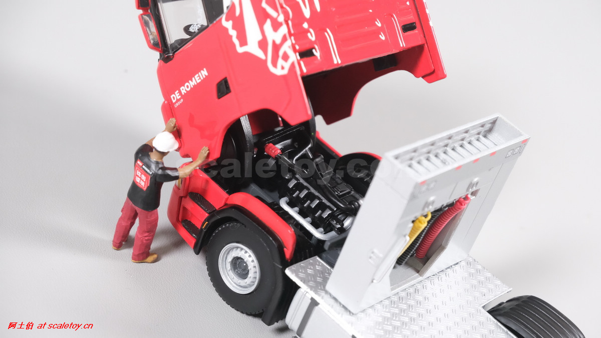 先看这款De Romein Groep的,斯堪尼亚 S系HIGHLINE CS20H 6X2 TWIN STEER拖头,BROSHUIS四轴轮井半低拖板。 模型编号01-4719,比例1/50: