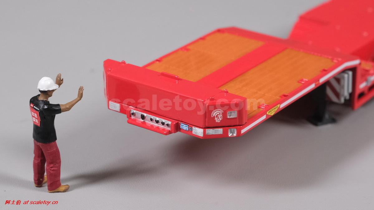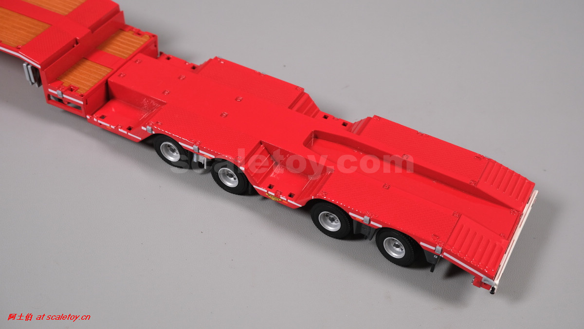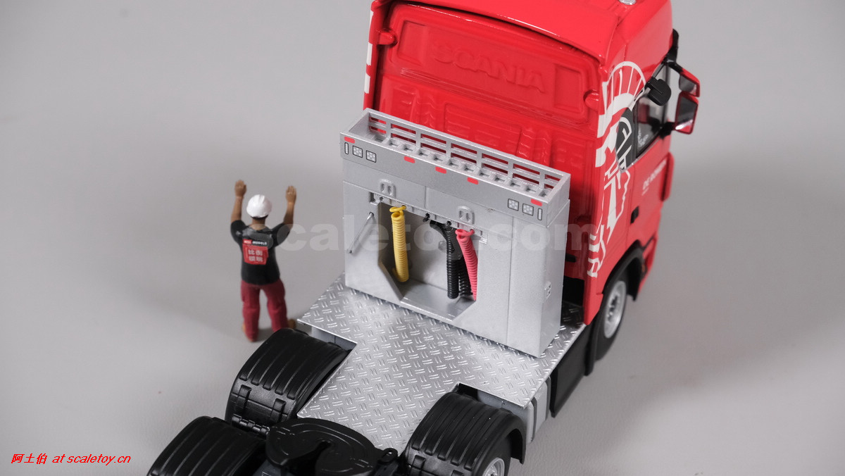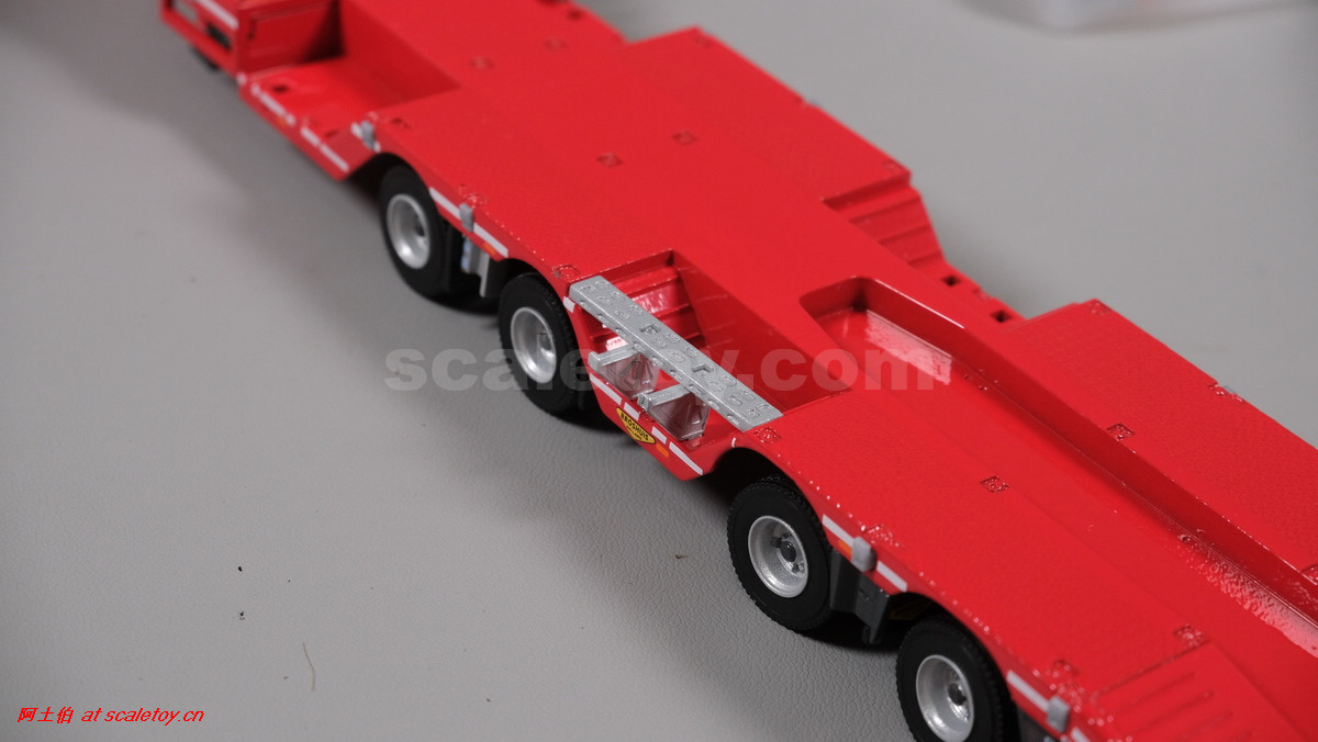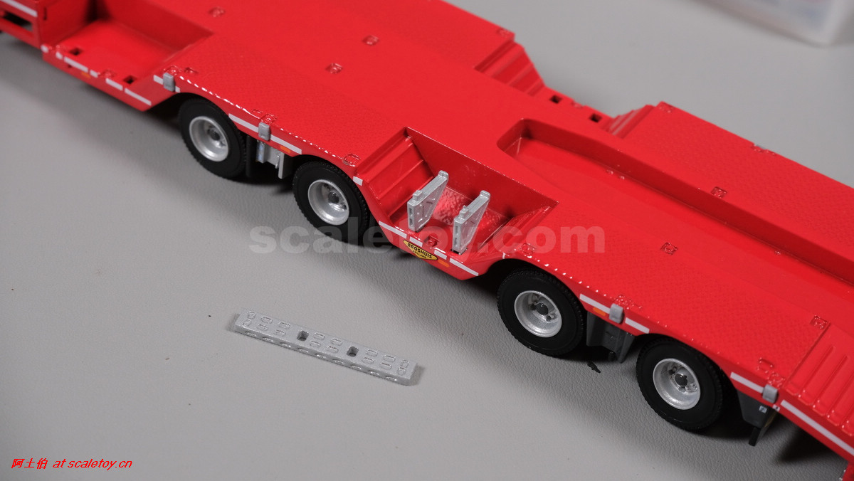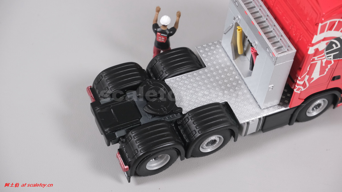 先看这款De Romein Groep的,斯堪尼亚 S系HIGHLINE CS20H 6X2 TWIN STEER拖头,BROSHUIS四轴轮井半低拖板。 模型编号01-4719,比例1/50: