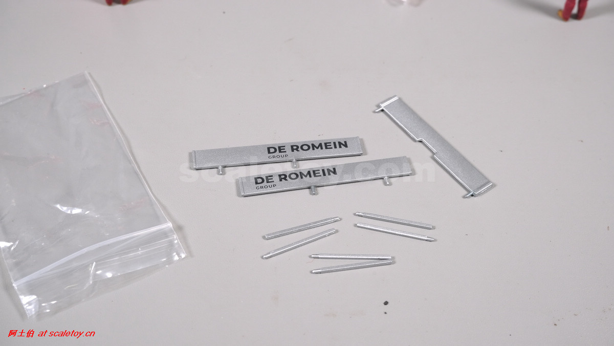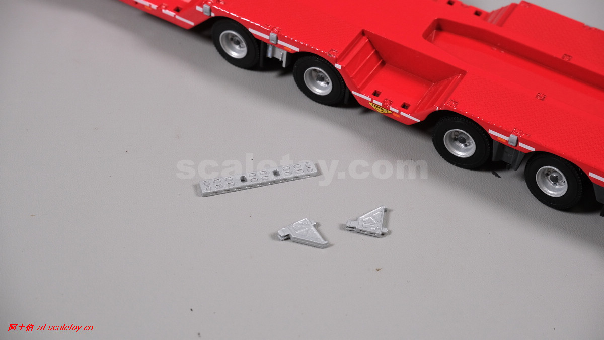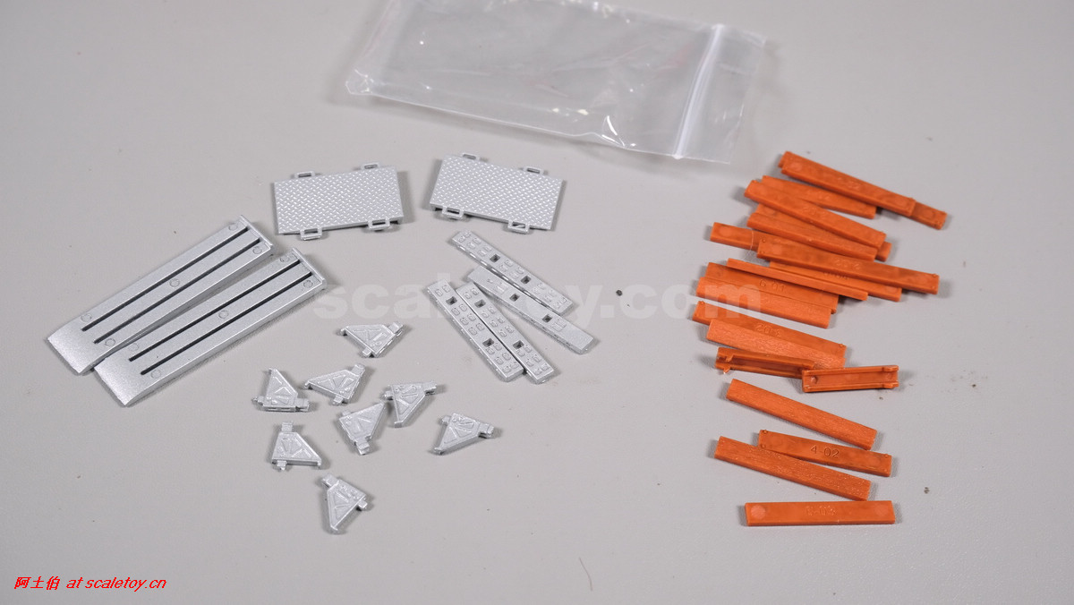 回到模型,包装内容,附件包括鹅颈围栏、插销栏杆、上下车坡道板、扩宽板、轮井支架等。