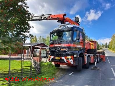 这是一款奔驰Arocs 8×4拖头,带帕尔菲戈随车吊,挂BROSHUIS四轴平板挂车。